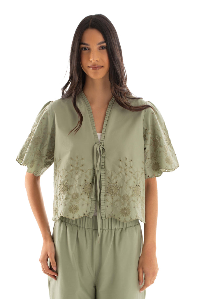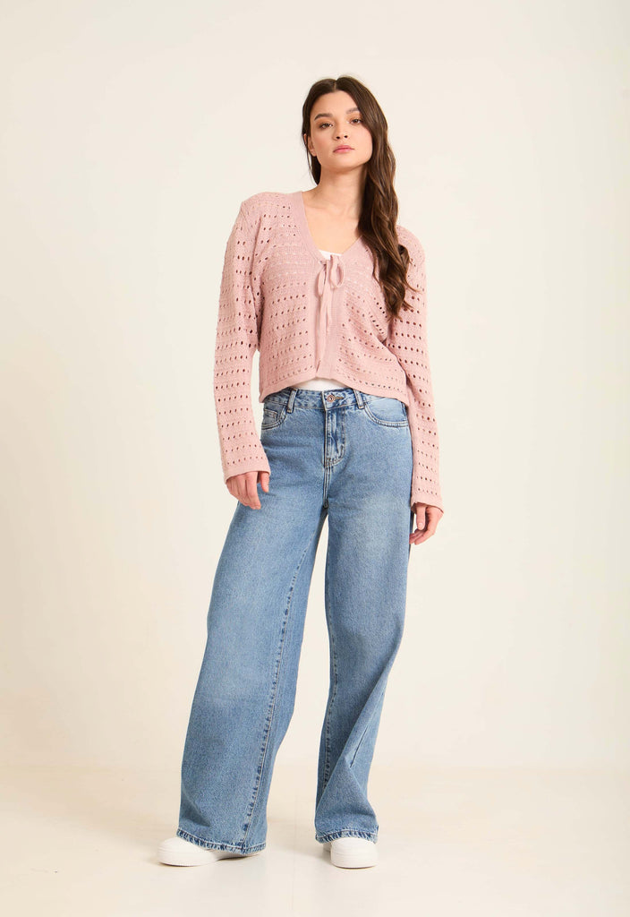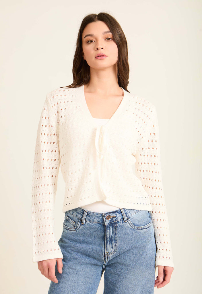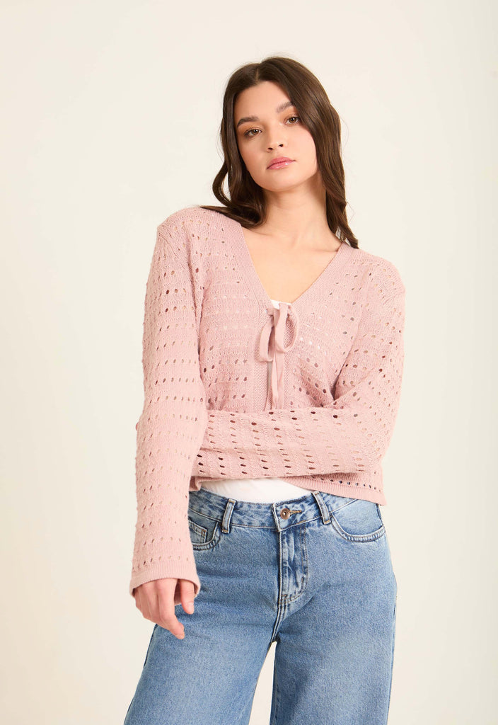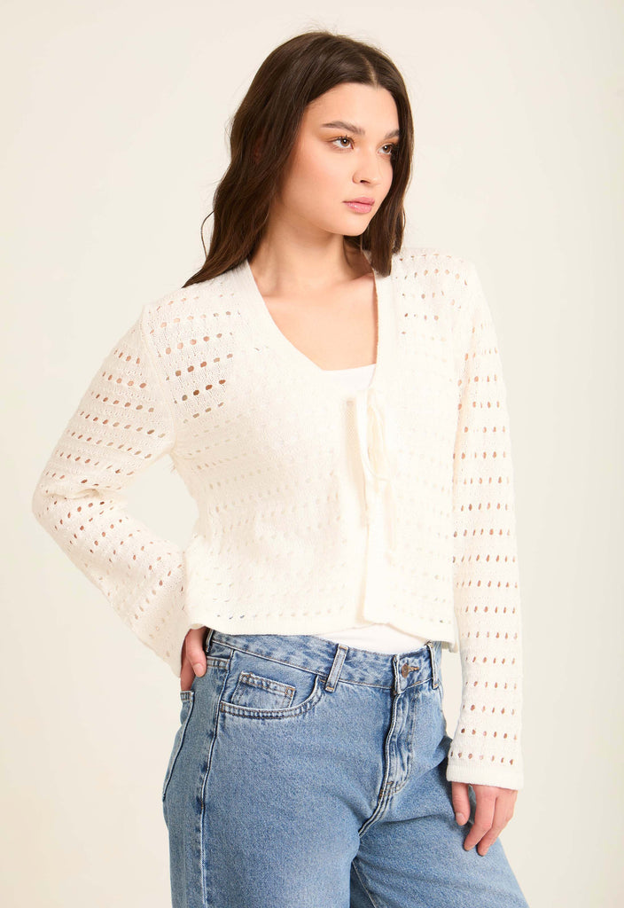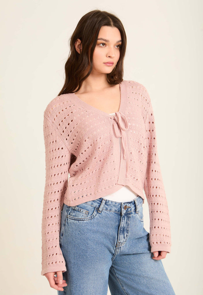 Perforated Knit Lace-Up Short Cardigan
